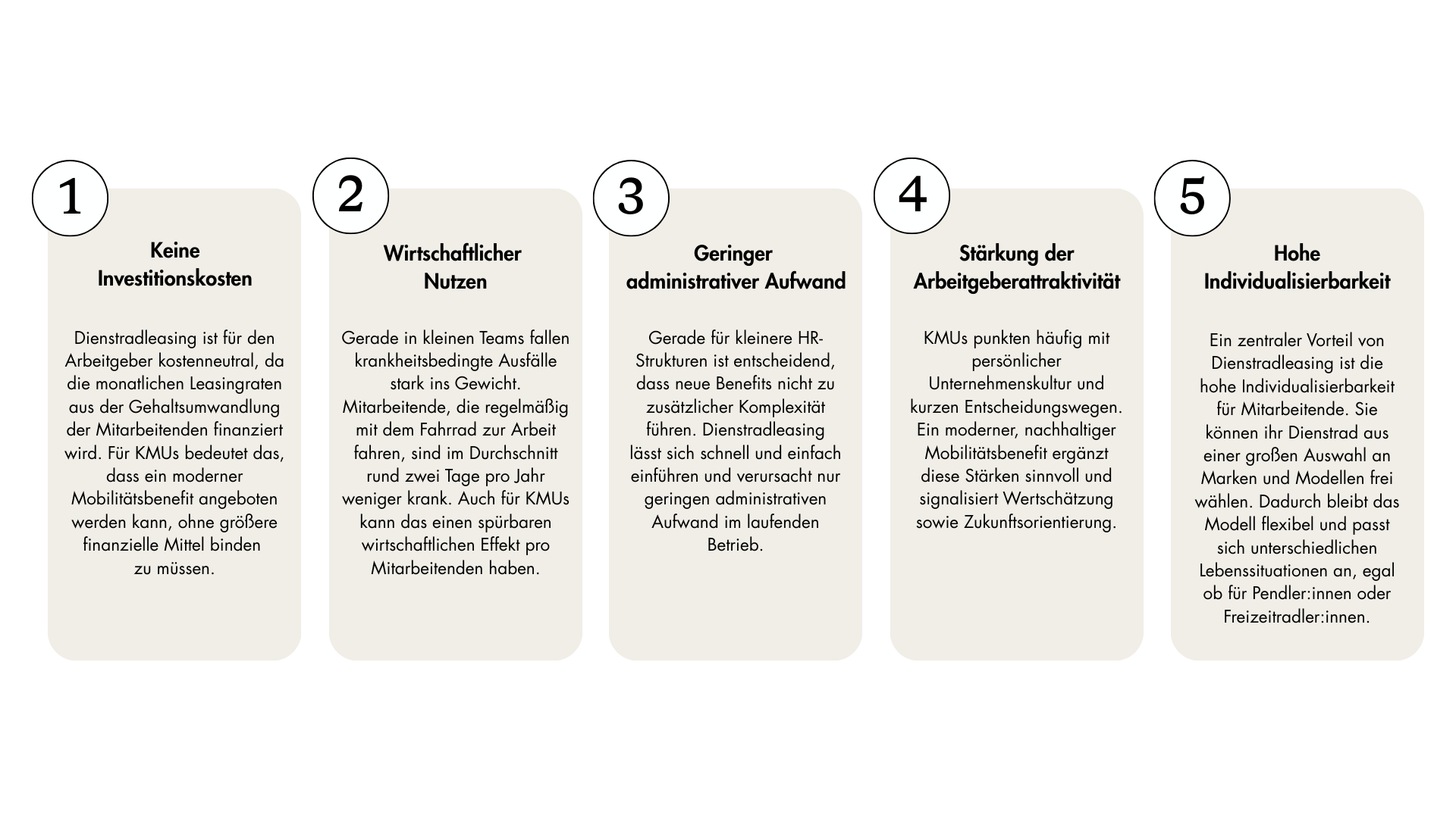Dienstradleasing ist längst kein exklusiver Konzern-Benefit mehr. Auch kleine und mittlere Unternehmen können damit Mitarbeitendengesundheit fördern, Fehlzeiten reduzieren und ihre Arbeitgeberattraktivität stärken - ohne Kosten oder komplexe Strukturen.