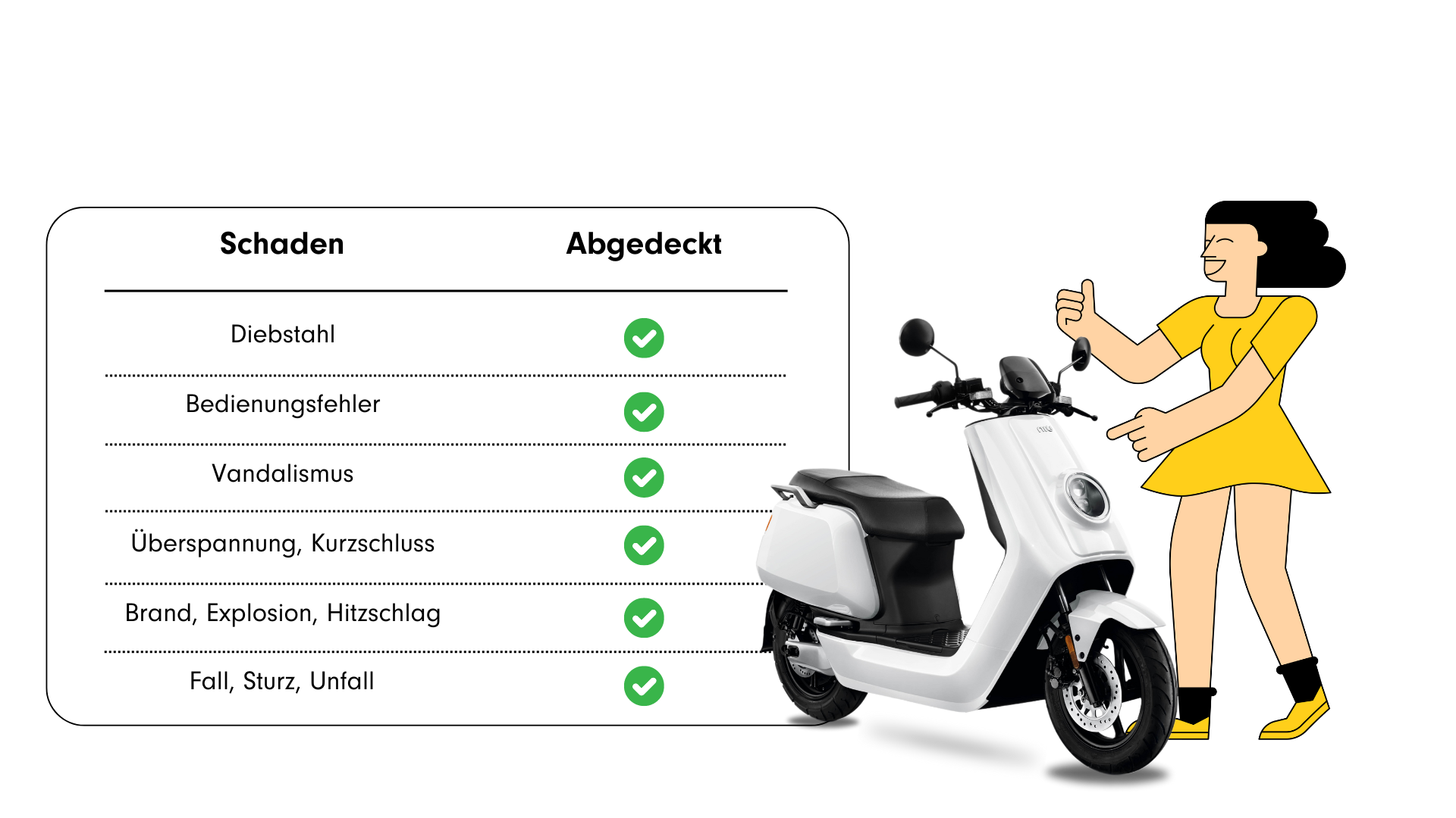 Damit du sorgenfrei unterwegs bist und mobil bleibst, sichern wir dich mit unserem Rundum-Schutz umfassend ab. Egal ob Sturz, Unfall, Diebstahl oder Ungeschicklichkeit. Dein Roller wird umgehend instand gesetzt oder im Fall der Fälle über den vollen Leasingzeitraum durch einen neuen Rollerersetzt.
